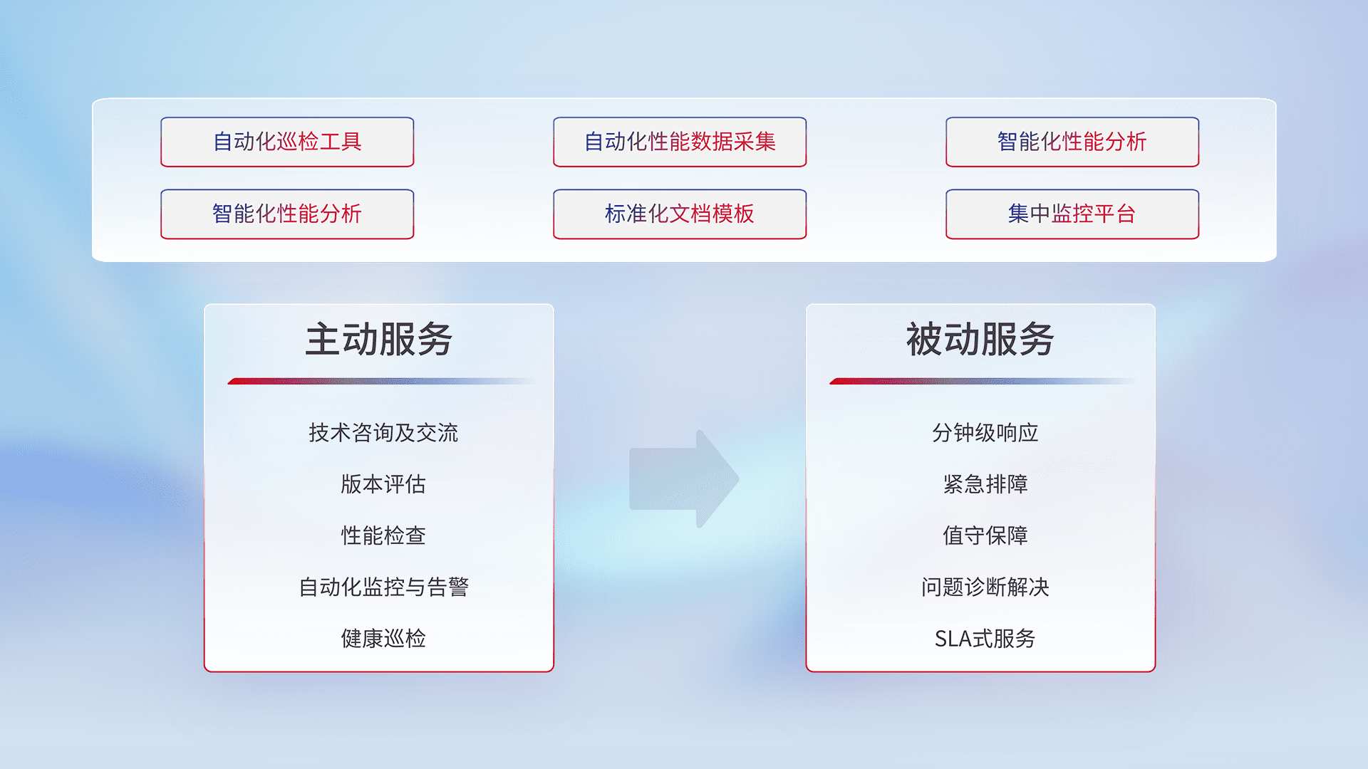 智能化工具和标准化文档,,,保障服务质量,,,,提供主动服务(包含技术咨询、、、版本评估、、性能检查、、、、自动化监控与告警、、、、健康巡检)和被动服务包含(分钟级响应、、紧急排障、、、值守保障、、问题诊断解决、、SLA服务)。。。。